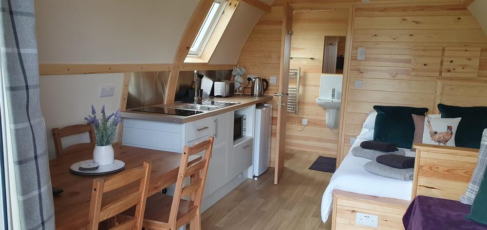 Each Wigwam has a double bed and double sofa bed (2 double sofa beds and 1 single bed in Accessible Lodge), an en-suite toilet and electric shower, fitted kitchen with microwave, toaster, kettle, fridge, double electric hob, sink, crockery and cookware, dining table and chairs, T.V, WiFi, private picnic bench and firepit.