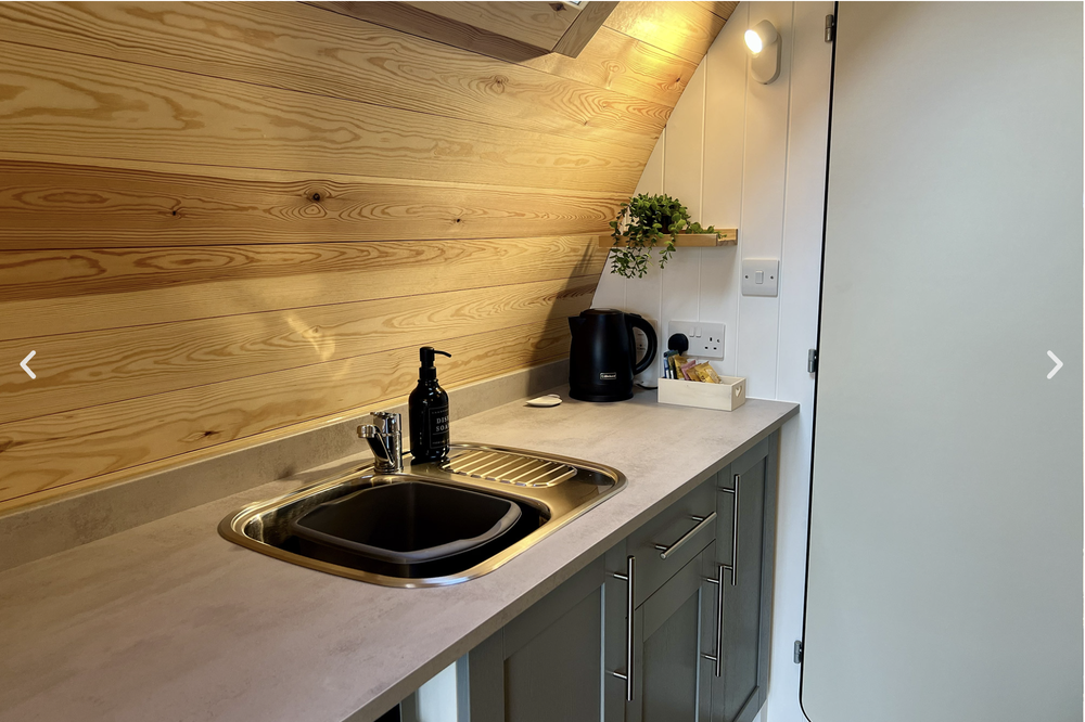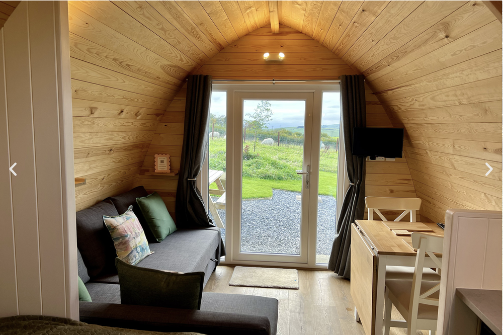 The pods are identical (almost), comfortably sleeping 2 adults and 2 children. Each pod boasts its own private outdoor space — the ideal spot to enjoy your morning coffee and breakfast while taking in the spectacular views and watching the sheep grazing in the nearby fields.