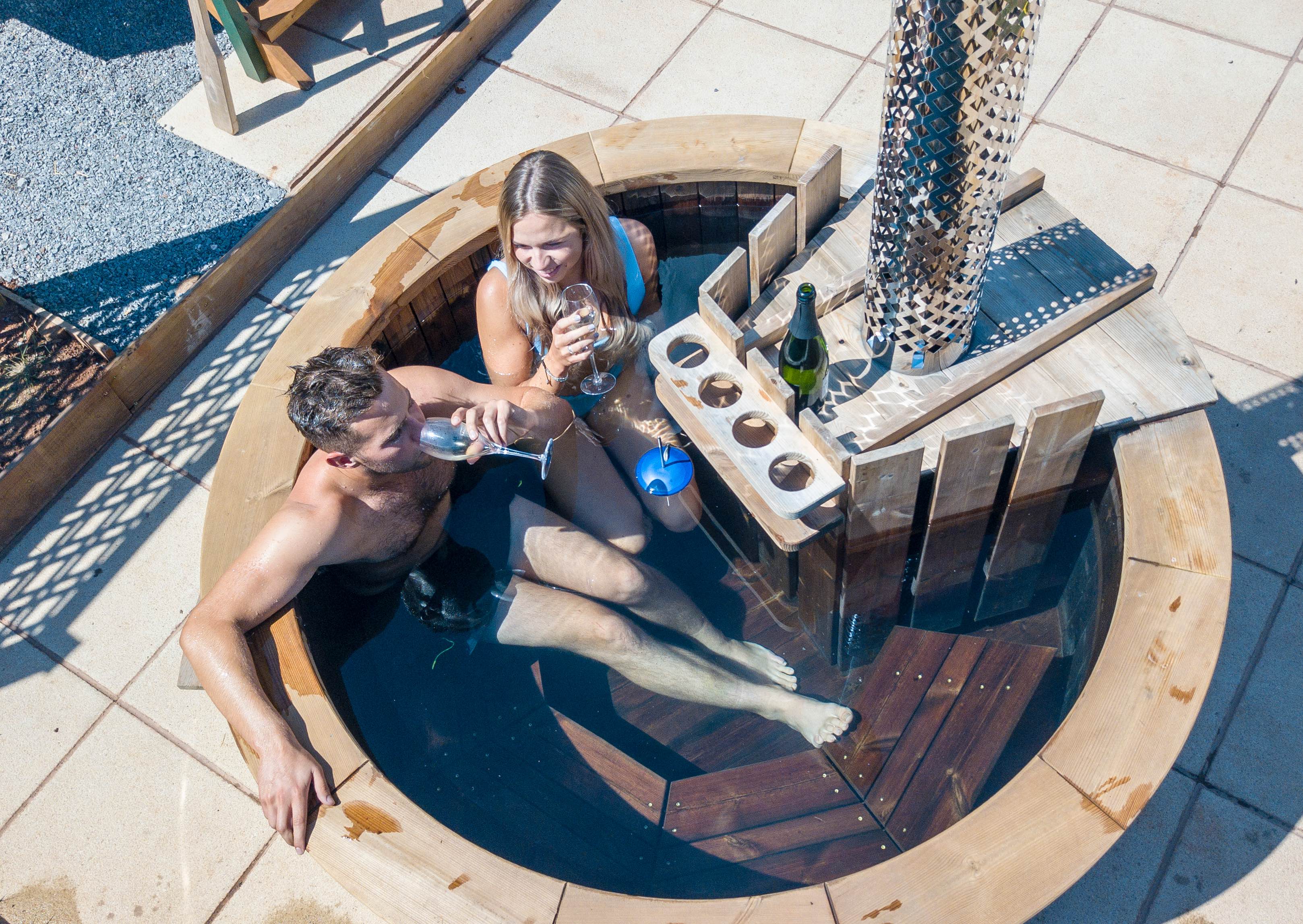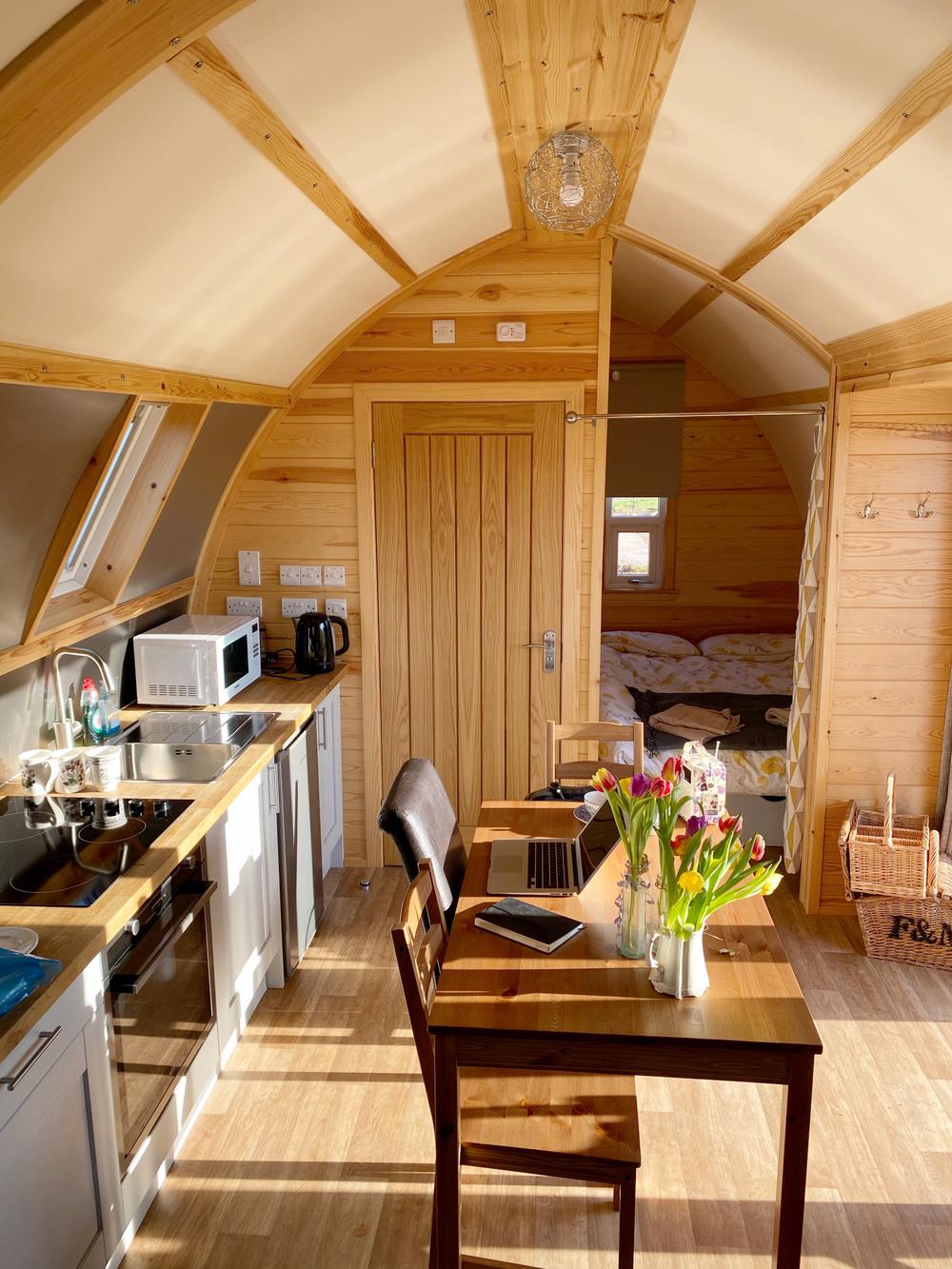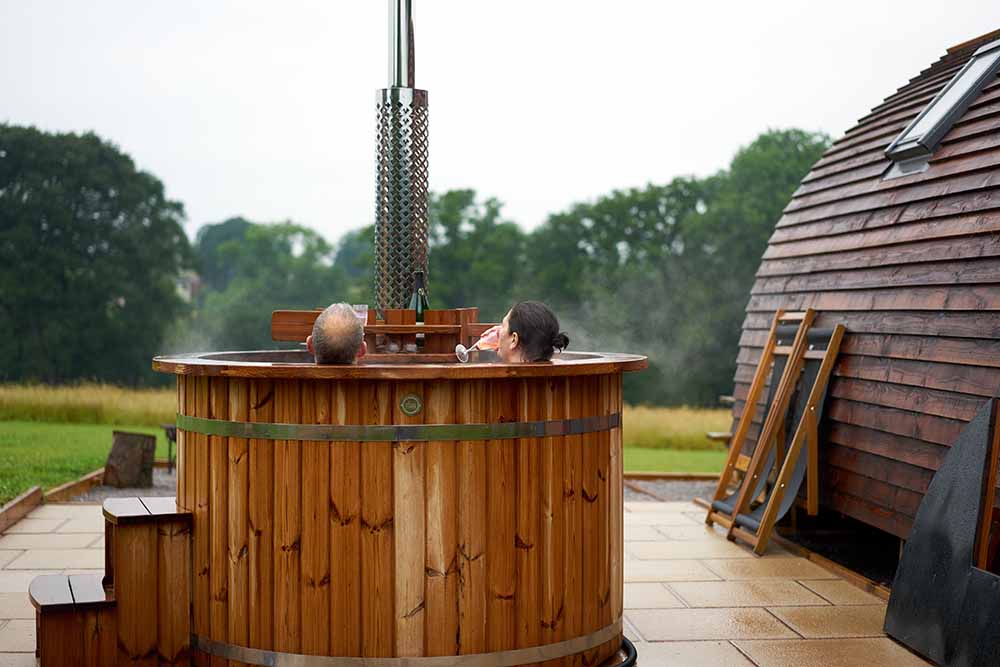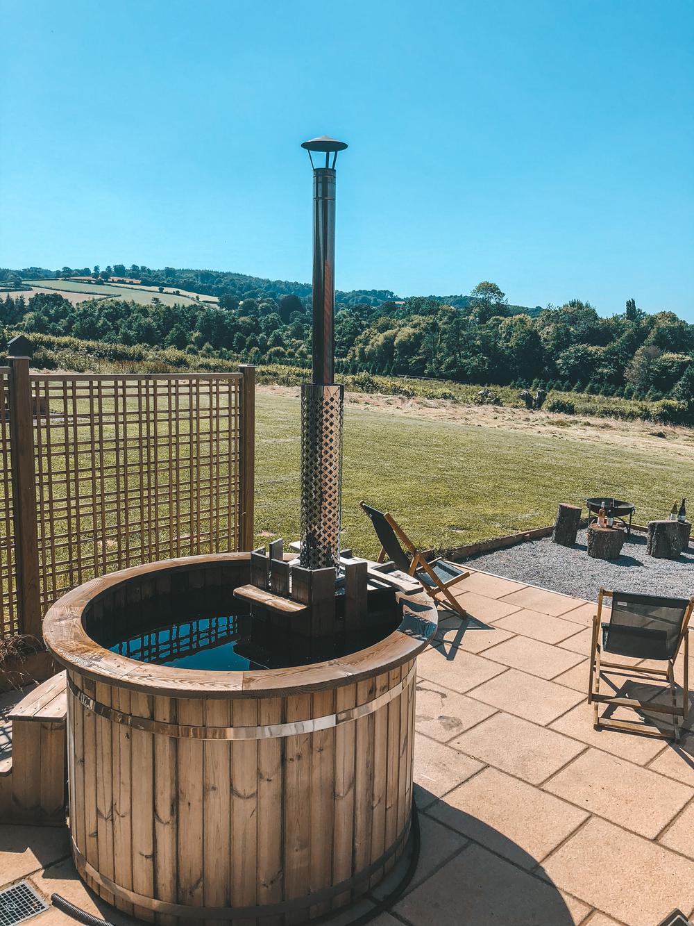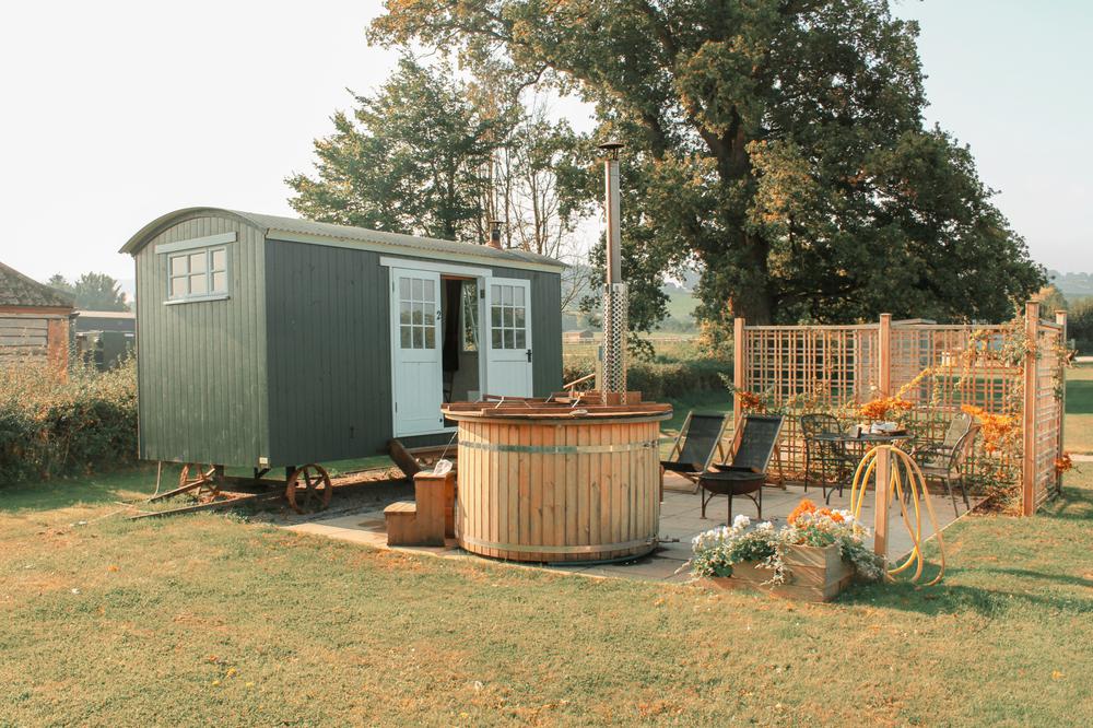 - 3 Shepherds Hut - Shepherd's Hut 1 and 2 each have their own wet room (shower, toilet and sink) a few steps away from the accommodation. Shepherd's hut 3 is ensuite and has its on small kitchen area. They each have their own wood fired hot tub and each booking includes a set of double bedding for the double bed inside each.
