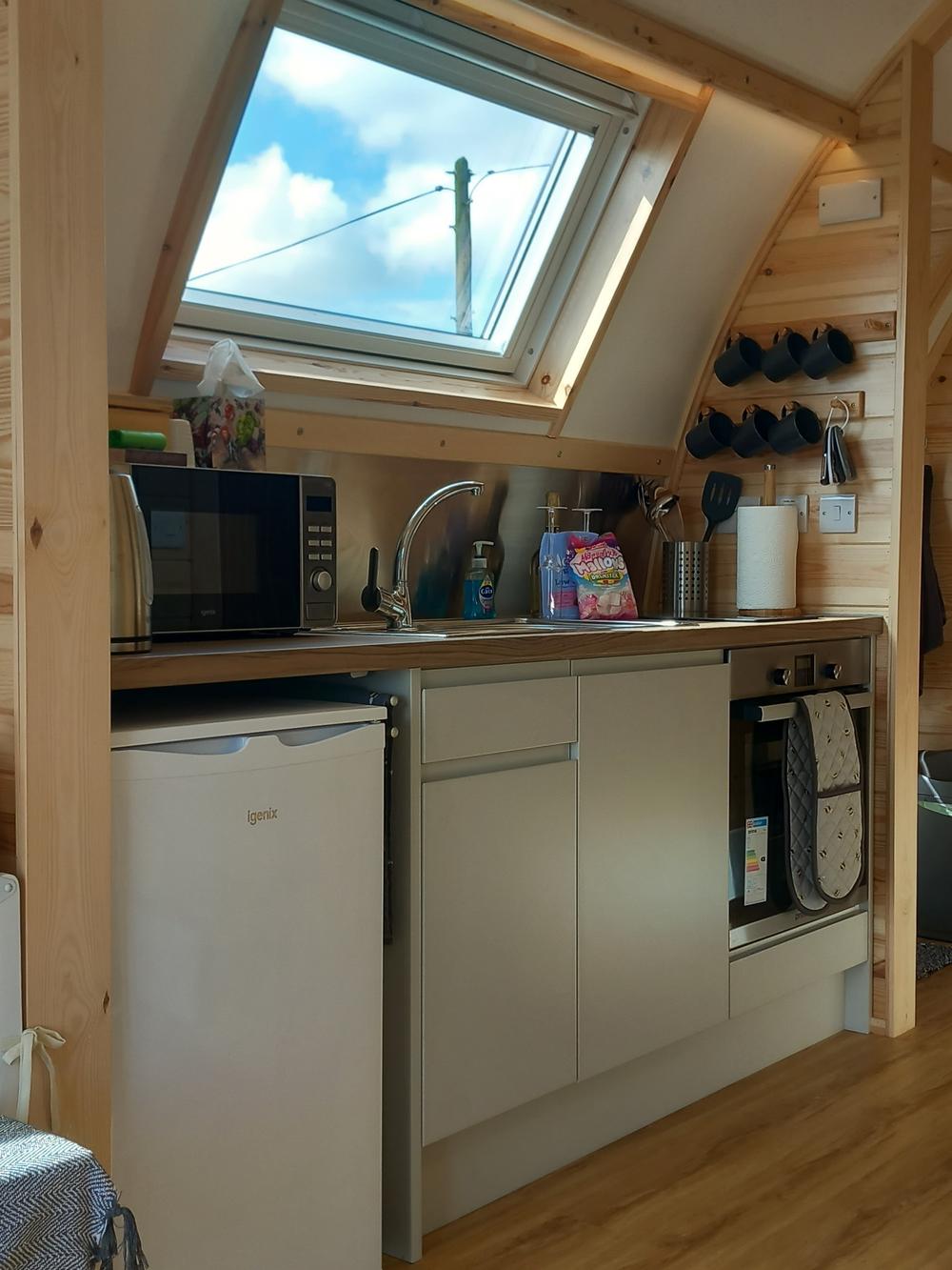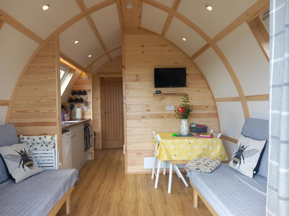Luxury en suite Wigwam Lodges with mattresses and sofas, dining table, all crockery, cutlery, pots, pans, kettle, toaster, microwave, fridge with small freezer, 2 ring hob, oven.