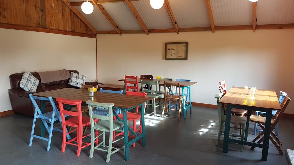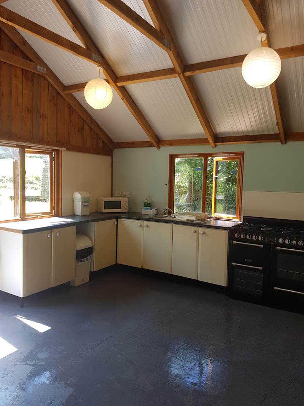 There are 3 toilets with wash hand basins, 4 showers (including one family shower room), 3 additional sinks in the shower room area, hand-dryers, kitchen area with cooker with oven and microwave (all cabins have a fridge, kettle and toaster in the cabin for individual guest use) and dining tables and sofa seating area. New for 2024, the kitchen now also has a selection of pots, pans, crockery, cutlery and kitchen utensils.